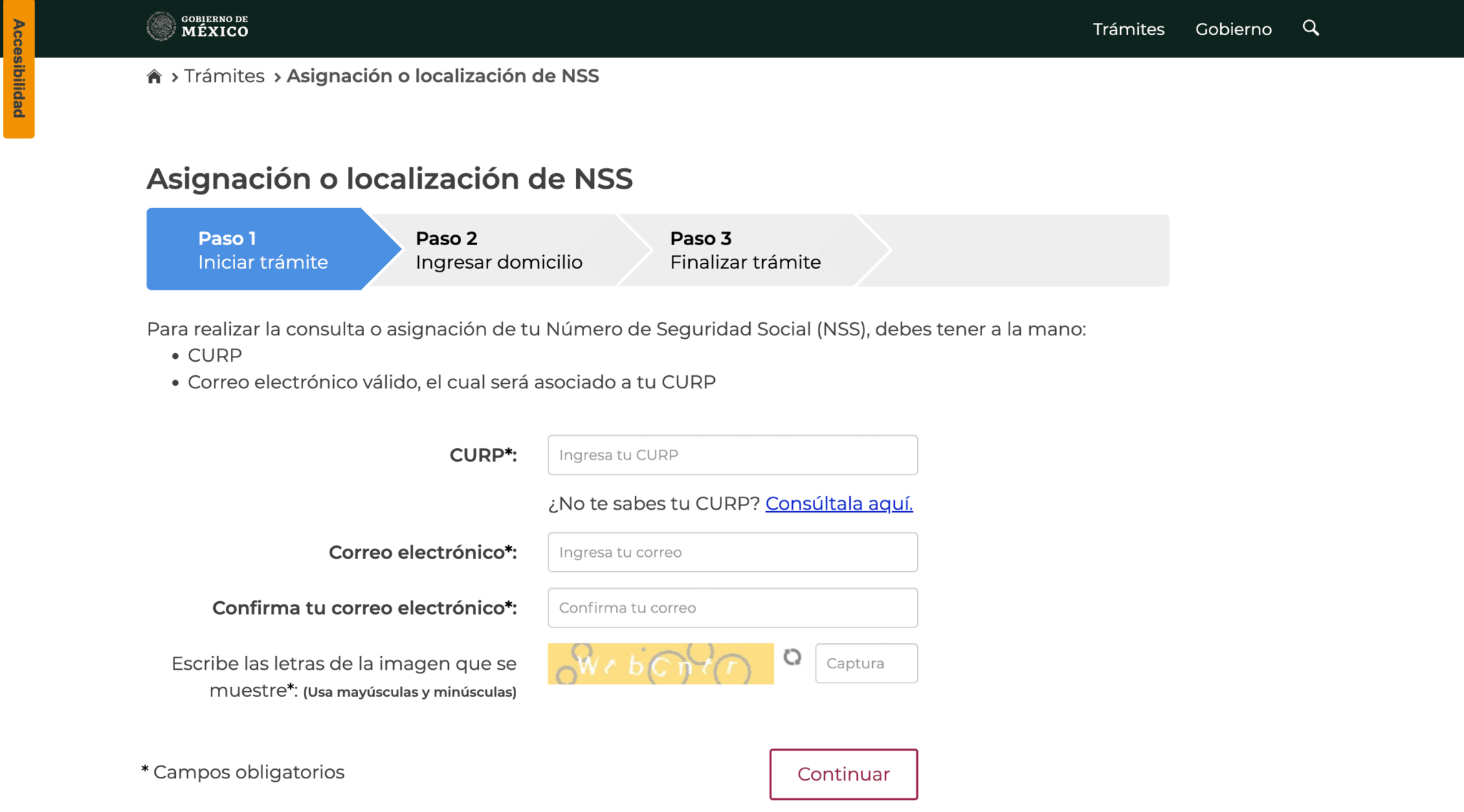 -  Serás redirigido a la página de asignación o localización de NSS. Captura los datos que solicita e ingresa las letras de la imagen desplegada. Haz clic en el botón Continuar.