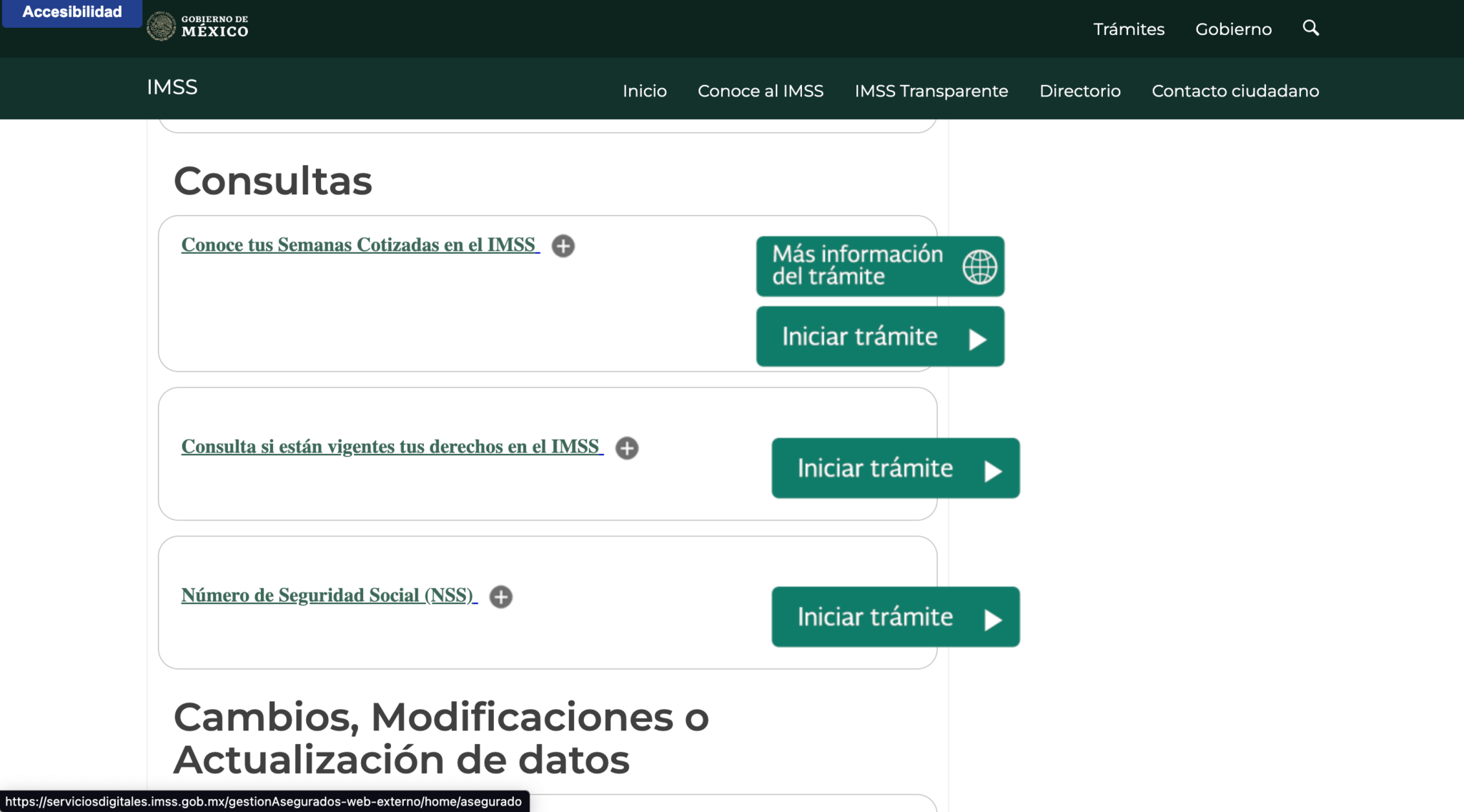 -  En la sección Consultas, busca NSS y haz clic en Iniciar trámite.